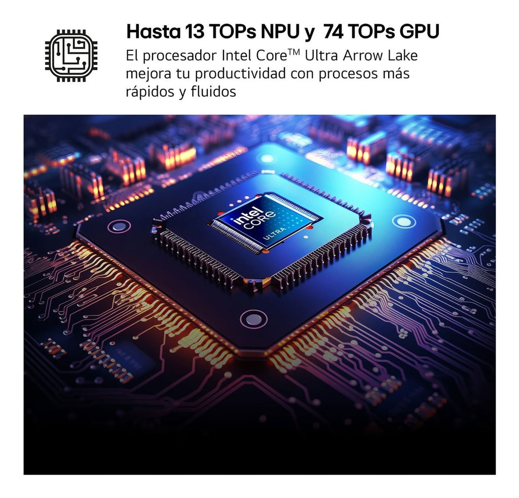 El último procesador Intel Arrow Lake , que incluye una Unidad de Procesamiento Neural (NPU) capaz de manejar hasta 13 teraoperaciones por segundo (TOPS) para tareas de AI, ahora está integrado en el LG gram, ofreciendo un rendimiento potente optimizado para portátiles. Con una eficiencia energética innovadora y el rendimiento distintivo de un procesador dedicado a la AI, maneja de manera eficiente las tareas de AI y aprendizaje automático