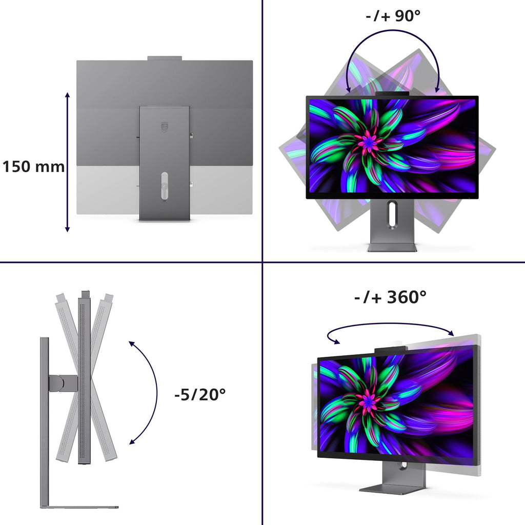 Este monitor con base de Philips está equipado con conexión Thunderbolt™ 4. En comparación con los monitores USB-C convencionales, la tecnología Thunderbolt™ 4 proporciona una velocidad de transferencia de datos ultrarrápida de 40 Gbps, compatibilidad con vídeos de alta resolución, transmisión a través de múltiples flujos para la conexión en cadena, hasta 96 W de potencia a dispositivos externos y una conexión Ethernet estable de 1 Gbps.