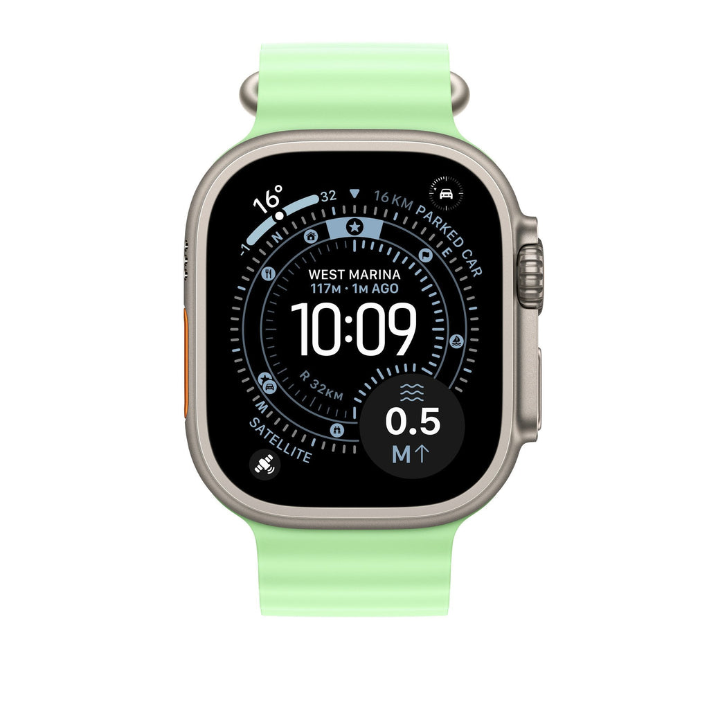 Fabricada en elastómero de alto rendimiento, la correa Ocean tiene una estructura tubular que permite estirarla para un ajuste perfecto, incluso encima de un neopreno. La hebilla de titanio resistente a la corrosión y el enganche ajustable evitan que la correa se mueva cuando practicas deportes acuáticos de alta velocidad.