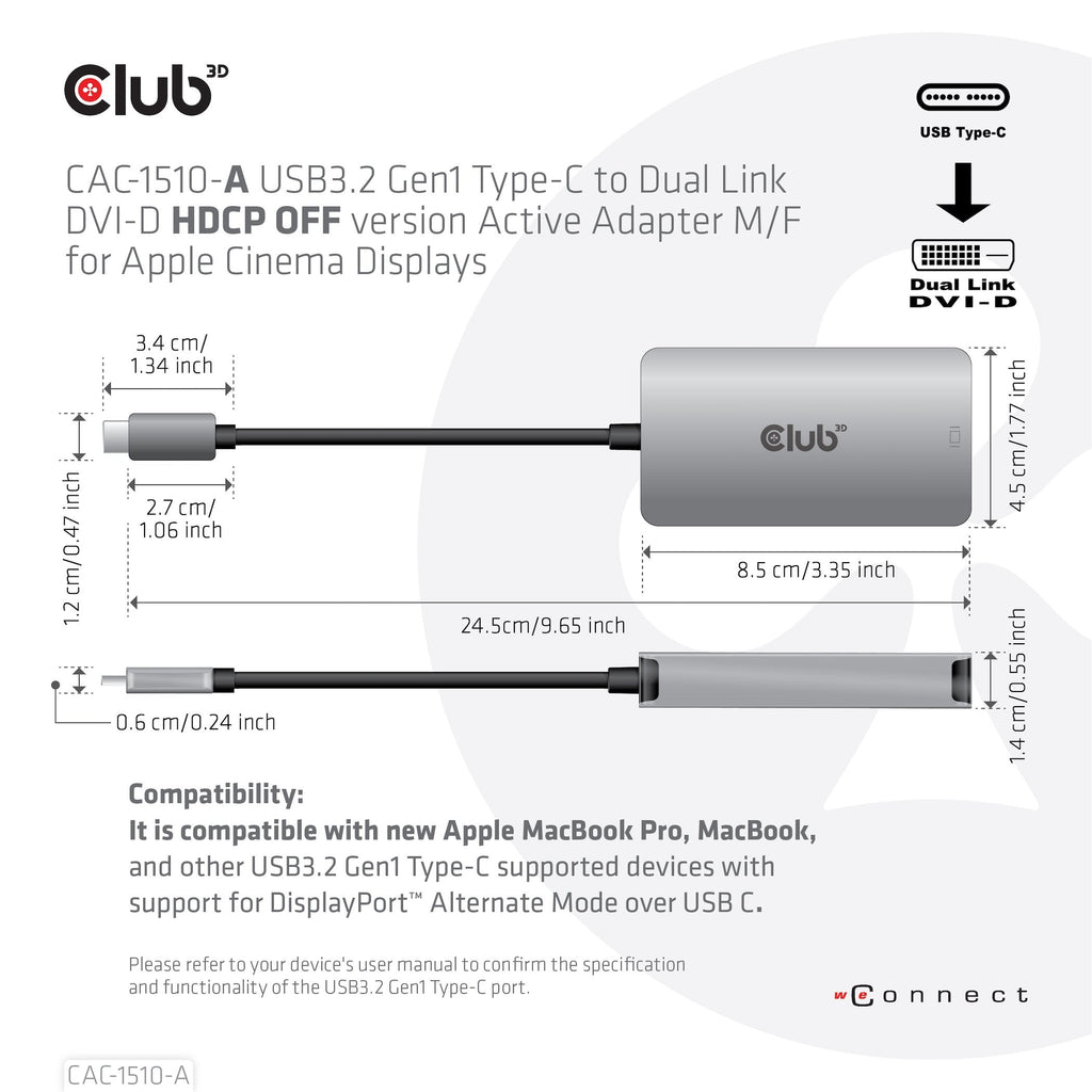 CLUB3D CAC-1510-A, 0,25 m, USB Tipo C, DVI, Macho, Hembra, 3840 x 2160