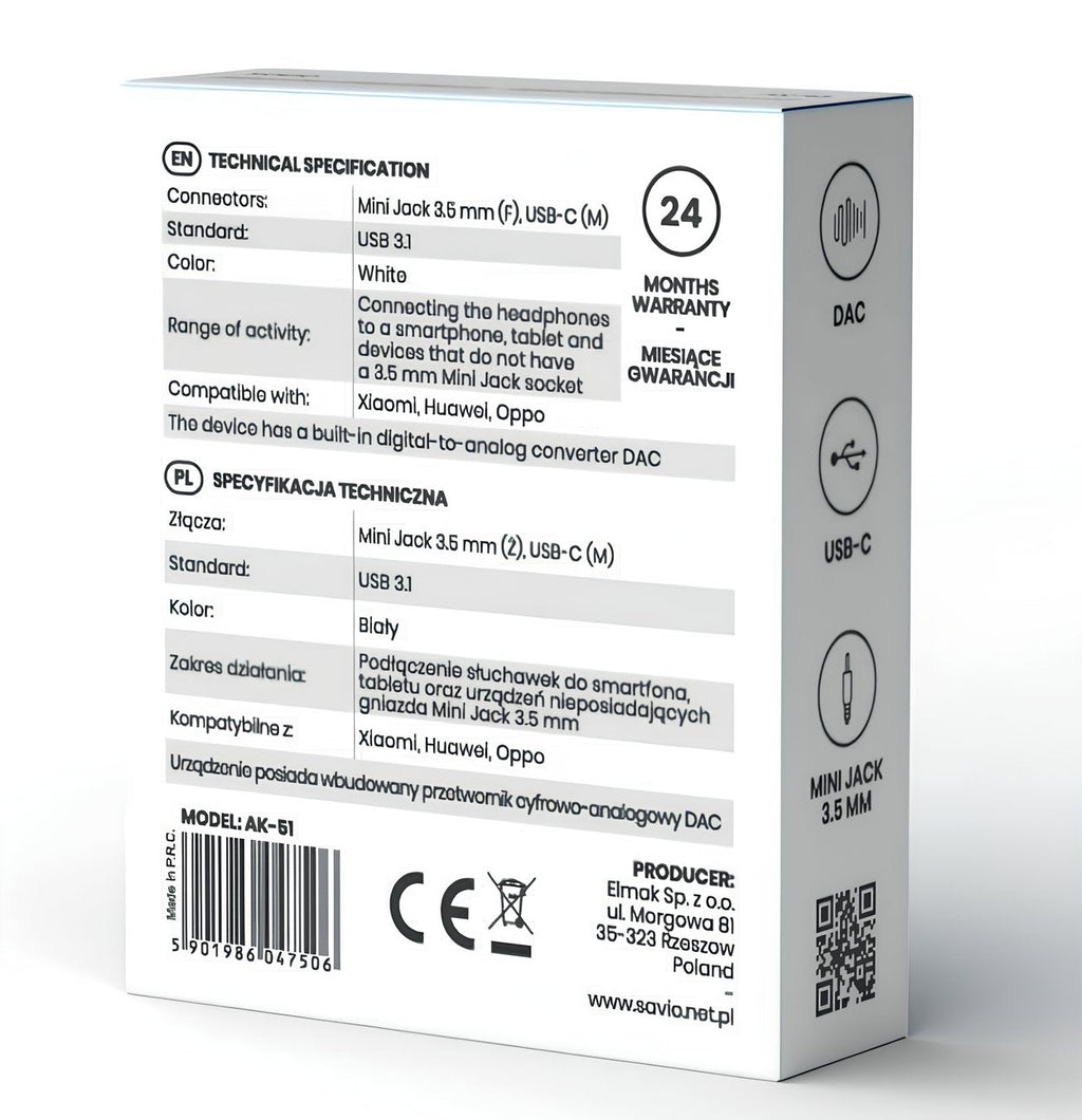 El adaptador cuenta con un distintivo convertidor digital a analógico (DAC) incorporado, que garantiza la mejor calidad de sonido transmitido. Con una longitud de aprox. 11 cm, el SAVIO AK-51 está fabricado con materiales de alta calidad, lo que asegura una larga vida útil y resistencia a roturas.