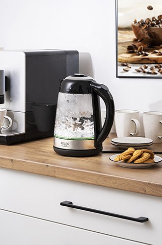 Adler AD 1285, 1,7 L, 2200 W, Negro, Acero, Transparente, Vidrio, Acero, Ajustes de termostato, Indicador de nivel de agua