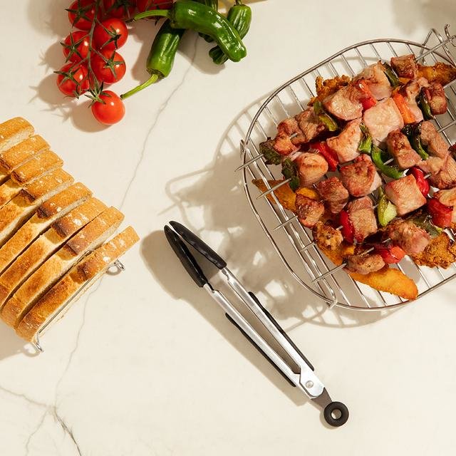 El kit de accesorios también cuenta con un soporte metálico, un soporte para tostar pan y pinzas con punta de silicona para que puedas cocinar siempre de la forma más cómoda y eficaz.