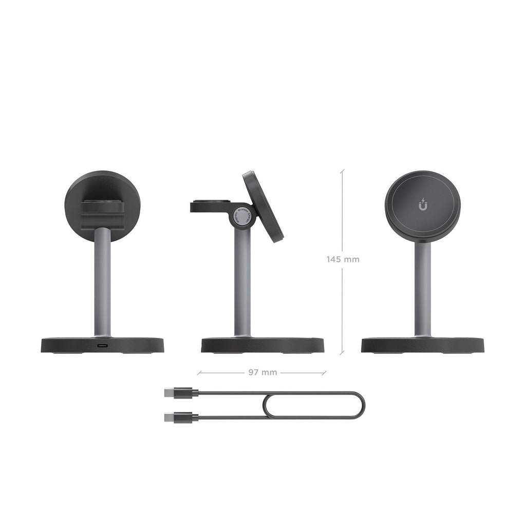 - Este cargador inalámbrico permite cargar varios dispositivos al mismo tiempo. Su diseño con soporte inclinado facilita el uso manos libres durante la carga. Solo coloca tu teléfono y se mantendrá cargando automáticamente. Nota: El móvil debe ser compatible con Qi2 o contar con una funda magnética para poder adherirse magnéticamente de forma segura y permitir la carga inalámbrica sin riesgo de caída.
