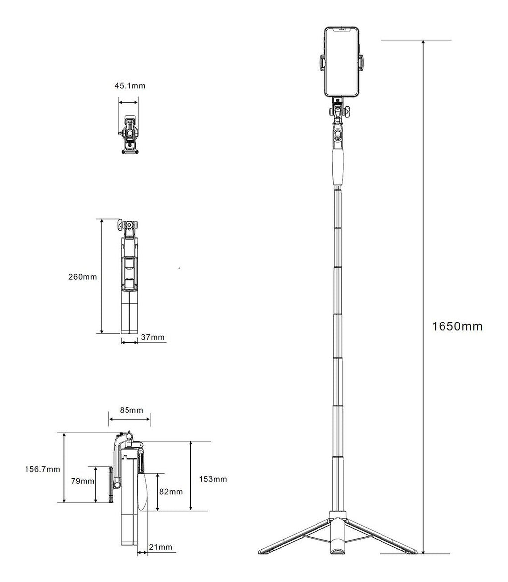 - Control remoto Bluetooth mejorado: Equipado con un mando a distancia Bluetooth recargable, este trípode ofrece un control conveniente y preciso de tus dispositivos móviles hasta a una distancia de 10 metros. Compatible con iOS/Android, este mando a distancia se puede guardar fácilmente en una ranura especial en el mango del palo selfie, evitando así posibles pérdidas