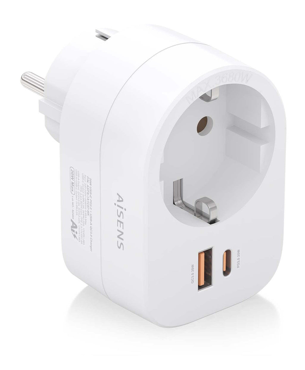 AISENS - Regleta De Pared Multifuncion Con 1 Toma + 1xUSB-C 20W PD3.0, 1xUSB-A 20W QC3.0, Blanco