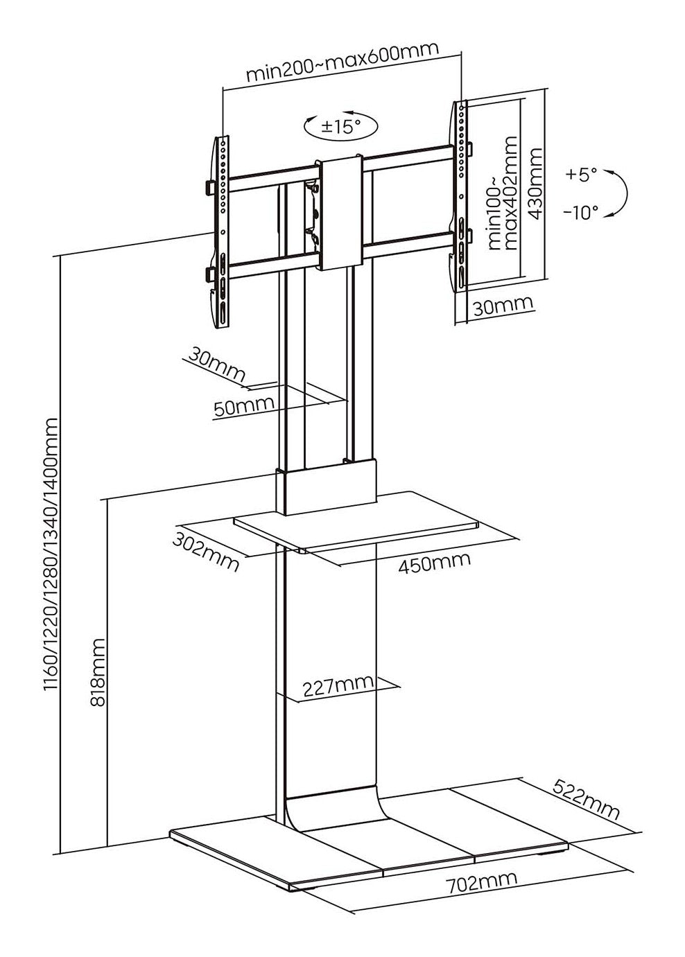 - Rango de ajuste para la altura del soporte TV: 1160 / 1220 / 1280 / 1340 / 1400mm