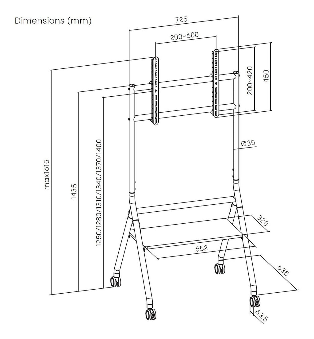 - Rango de ajuste para la altura del soporte TV: 1250/1280/1310/1340/1370/1400 mm