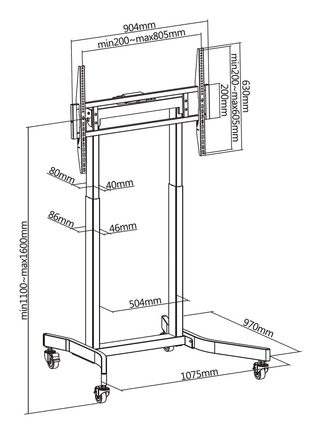 - Rango de ajuste para la altura del soporte TV (desde el punto medio de la vesa hasta el suelo): ajustable entre 1100 y 1600mm