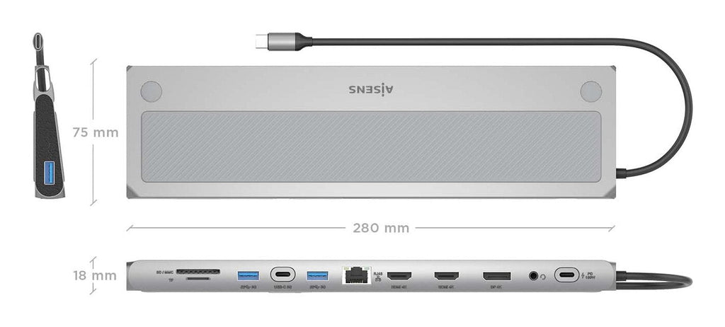 - Conversor USB-C a 2xHDMI, 1xDISPLAYPORT SST MST, 1xRJ45, 3xUSB-A 5G, 1xUSB-C 5G, 1xUSB-C PD 100W, 1xLector de tarjeta SD, 1xLector de tarjeta MICRO SD, 1xAudio