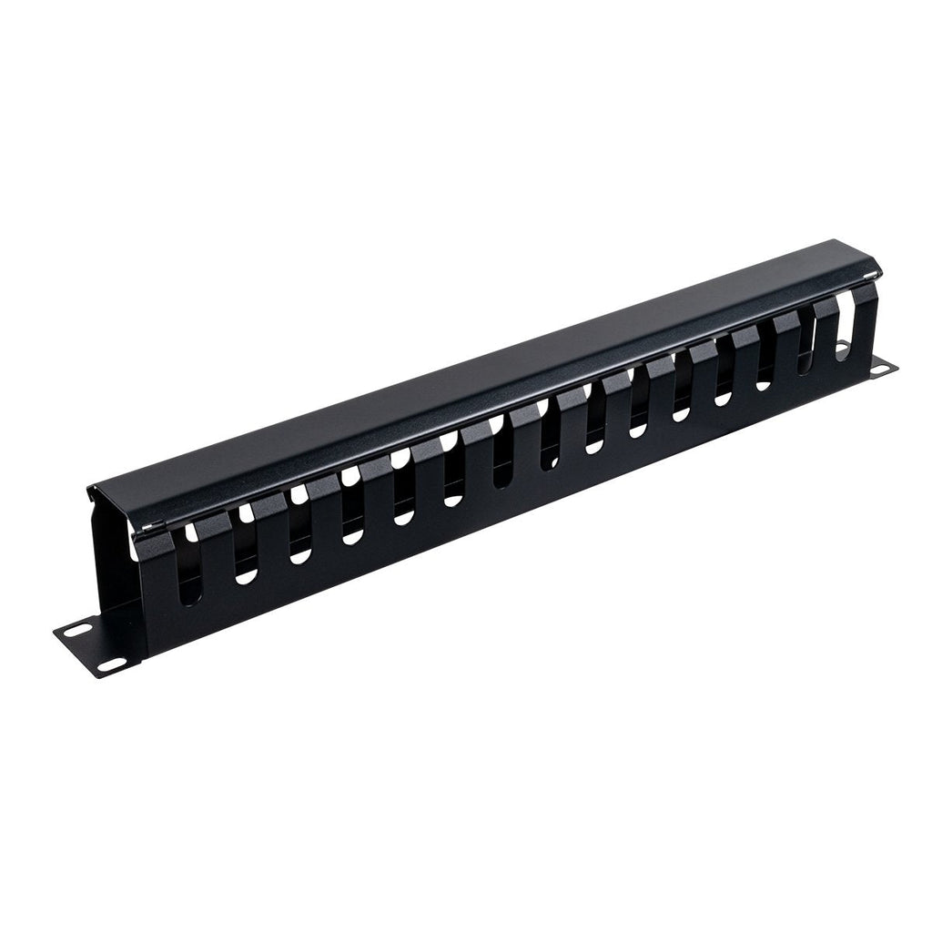 Organizador de cables metálico en negro con tapa. Modelos de 1U y 2U de 19″.