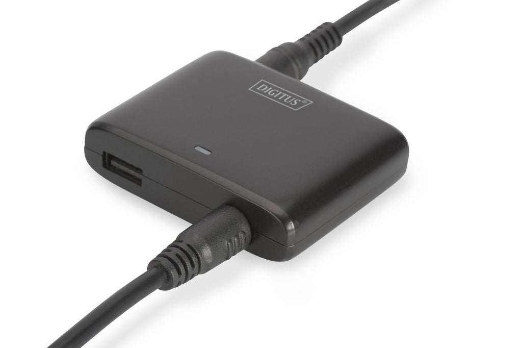 El adaptador de alimentación universal y ultra compacto portátil DIGITUS para coche es la fuente de alimentación secundaria perfecta para usar diariamente, durante los viajes o durante trayectos cortos. Cargue sus dispositivos rápidamente en el coche con la toma del encendedor. Ofrece 11 adaptadores de carga para casi cualquier portátil de las marcas más comunes tales como Acer, Asus, Samsung, Sony, HP, Toshiba, Lenovo, Fujitsu, IBM, Compaq, NEC, etc. La tensión de salida requerida es controlada automáticamente por el cargador seleccionado. También cuenta con una toma de carga USB para cargar dispositivos móviles, tales como smartphones, tablets, cámaras, etc. Tanto el ordenador portátil como la propia fuente de alimentación están protegidas contra cortocircuitos, sobrecalentamiento, sobretensión y sobrecorriente.