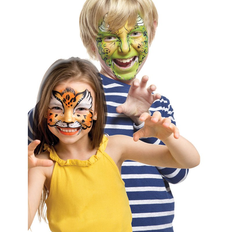 Set de maquillaje Alpino Animals. Contiene: 6 barritas de 5 gr, color blanco, amarillo, naranja, verde, marrón y negro, tatuajes brillantes en calcomanía, lápiz perfilador cosmético, pincel, 2 bolsitas de purpurina y folleto paso a paso. Producto cosmético. Se lava con agua. Testado dermatológicamente. Maquillaje listo para usar, no necesita base maquillaje ni crema hidratante. Maquillaje para fiestas. Uso infantil y adulto.