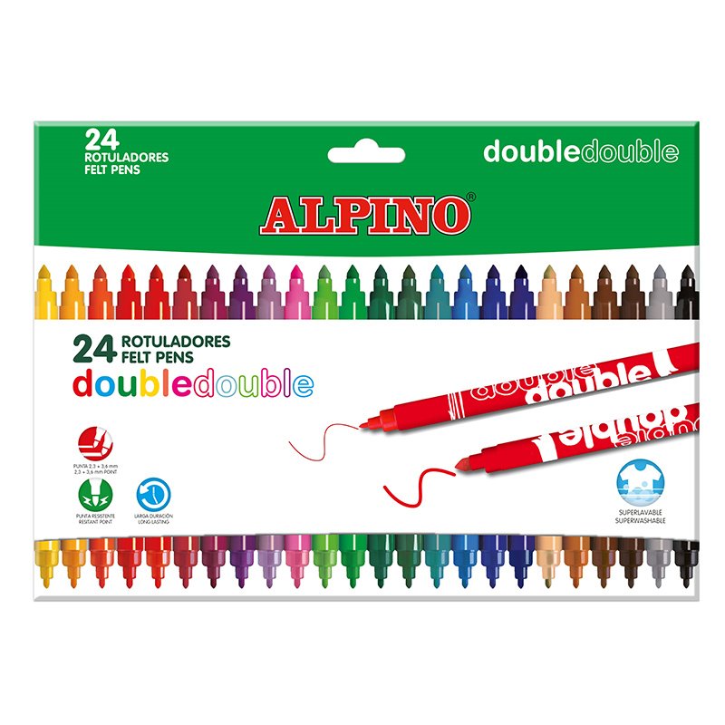 Rotuladores de doble punta caja 24 unidades. Tú eliges: pinta grueso o pinta fino con un mismo rotulador. Los colores son superbrillantes y además la tinta es superlavable. Son ideales tanto para trabajos escolares como para pintar dibujos o mandalas ya que permiten rellenar grandes superficies con la punta gruesa y perfilar detalles con la punta final.