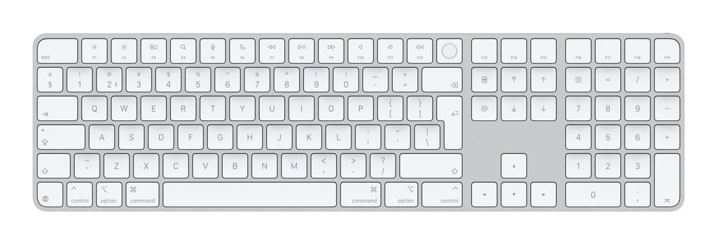 El Magic Keyboard con Touch ID y teclado numérico te permite escribir con total precisión y comodidad. Tiene un diseño ampliado, con controles de navegación para recorrer los documentos fácilmente y teclas de flecha de tamaño estándar que son una gozada para tus partidas. Su teclado numérico es perfecto para hojas de cálculo y aplicaciones financieras. Es inalámbrico e integra una batería recargable de gran autonomía, así podrás olvidarte de cargarlo durante un mes o más. Se enlaza de forma automática al Mac para que puedas usarlo enseguida.