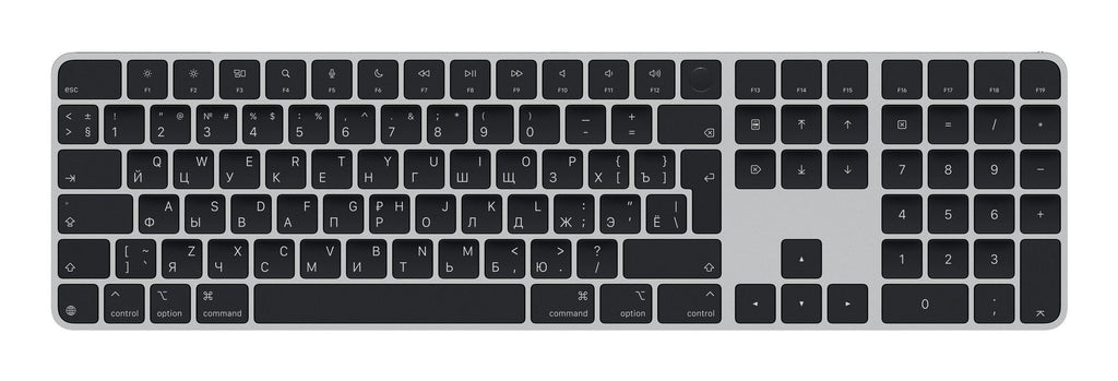 El Magic Keyboard con Touch ID y teclado numérico te permite escribir con total precisión y comodidad. Tiene un diseño ampliado, con controles de navegación para recorrer los documentos fácilmente y teclas de flecha de tamaño estándar que son una gozada para tus partidas. Su teclado numérico es perfecto para hojas de cálculo y aplicaciones financieras. Es inalámbrico e integra una batería recargable de gran autonomía, así podrás olvidarte de cargarlo durante un mes o más. Se enlaza de forma automática al Mac para que puedas usarlo enseguida.