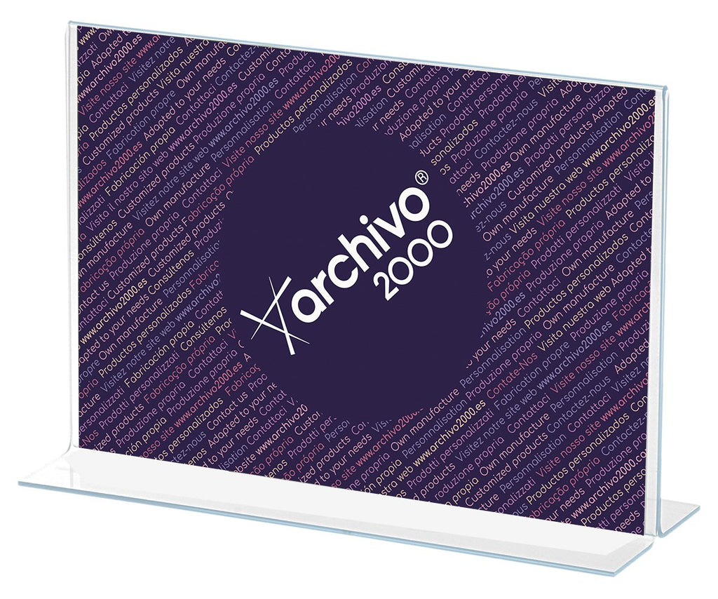 Expositor sobremesa en forma de T Archivo 2000 A4 horizontal. Fabricado en poliestireno ultra transparente de gran calidad y resistencia. Visibilidad por ambas caras. El documento se introduce por la parte inferior o por cualquiera de los laterales. Amplia base que lo hace muy estable