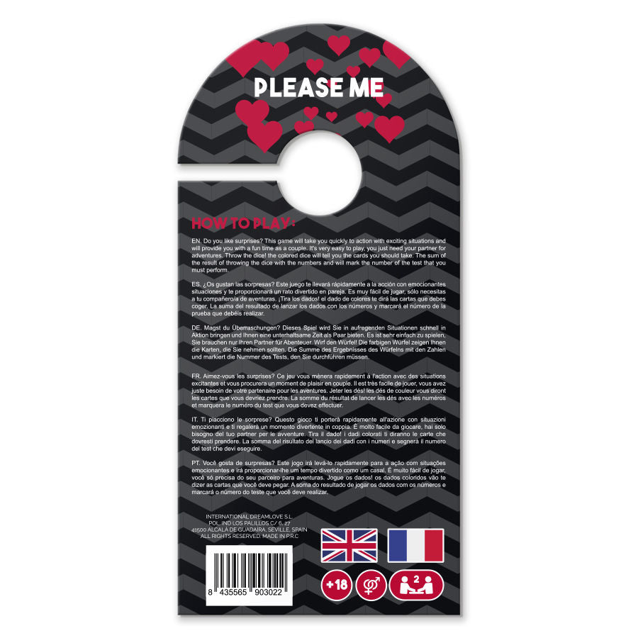 ¿Os gustan las sorpresas? Este juego te llevará rápidamente a la acción con emocionantes situaciones y te proporcionará un rato divertido en pareja. Es muy fácil de jugar, solo necesitas a tu compañero de aventuras. ¡Tira los dados! El dado de colores te dirá las cartas que debes coger. La suma de resultado de lanzar los dados con los números y marcará el numero de la prueba que debéis lanzar.