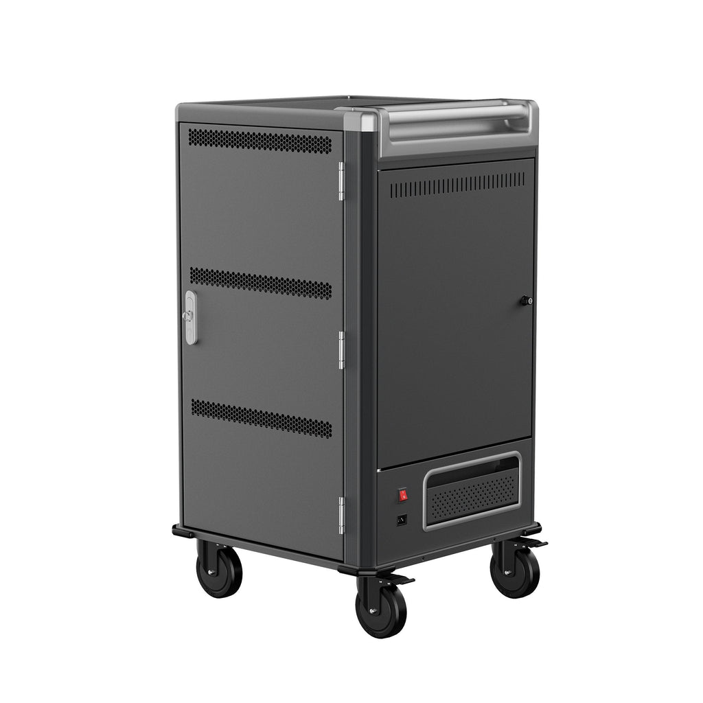 El carro de carga EW1700 le permite proteger, almacenar y cargar fácilmente hasta 30 dispositivos Tablets, Chromebook o portátiles con pantallas de hasta 17". Cuenta con un sistema de carga inteligente, estantes con ranuras para dispositivos flexibles y duraderas, un sistema de administración de cables/fuente de alimentación y, lo mejor de todo, está completamente ensamblado para una implementación rápida. Además, cuenta con espacios numerados para dispositivos y sus correspondientes espacios para suministro de energía para optimizar la organización. El carro también cuenta con puertas ventiladas con un mecanismo de bloqueo con llave de 3 puntos y la opción de agregar su propio candado para mayor seguridad.