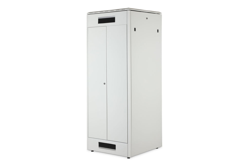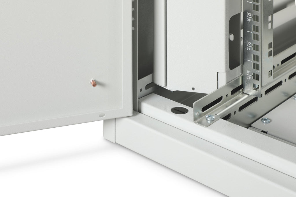 Los armarios de red de la serie Unique se han diseñado y fabricado para un cableado de red especialmente cómodo y flexible. Las sofisticadas optimizaciones ofrecen una estabilidad acorde con el mercado con la máxima flexibilidad. Un chasis base modular, que puede abrirse mediante paneles ciegos atornillados de 483 mm (19"), ofrece espacio suficiente para cables de todo tipo. Además, hay entradas de cables laterales con escobillas en la parte superior e inferior del armario, así como otra en la parte trasera del chasis base. Las regletas de escobillas traseras por encima y por debajo de la puerta trasera (a partir de 26U) permiten su uso en una amplia gama de escenarios de aplicación. Los amplios conductos de cables verticales con ayudas para el guiado de cables y tapa, instalados en la parte delantera (a partir de 800 mm de ancho de armario), completan a la perfección las versátiles características del armario de red. En el interior hay instalados dos pares de carriles de perfil de 483 mm (19") galvanizados y con manivela, etiquetados con unidades de altura que pueden leerse en direcciones opuestas. Se pueden ajustar de forma continua y están conectados a puntales de profundidad adicionales en el armario. Cada armario es una robusta construcción de chapa de acero de hasta 1,5 mm de grosor. La coloración se realiza mediante recubrimiento electrostático en polvo en los colores estándar gris (RAL 7035) y negro (RAL 9005). Los paneles laterales y las puertas modulares bloqueables y desmontables mejoran la accesibilidad. Las bisagras de las puertas pueden cambiarse. Además, los armarios pueden desmontarse completamente en caso necesario gracias a su diseño desmontable.