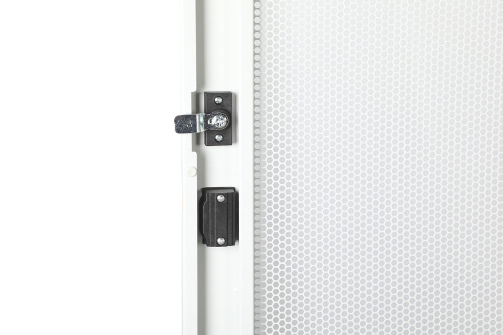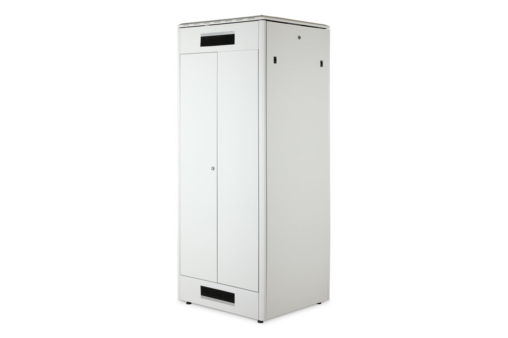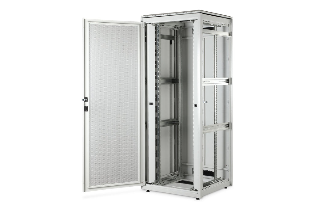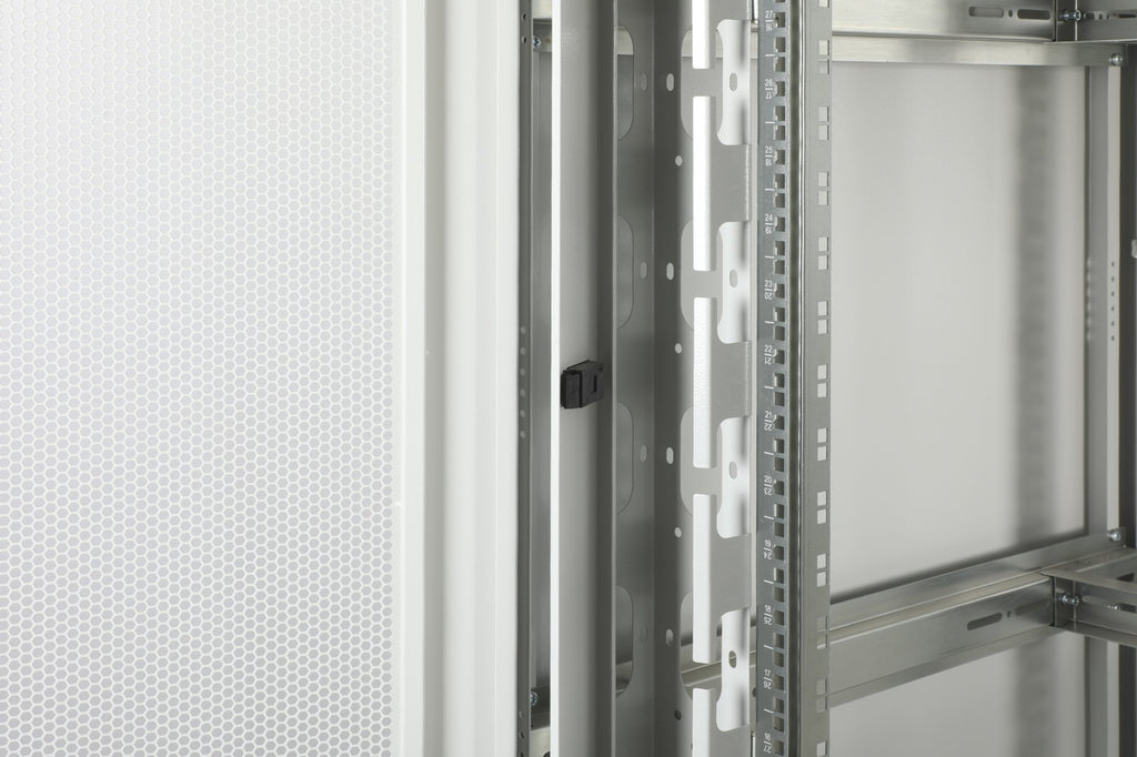 Los armarios de red de la serie Unique se han diseñado y fabricado para un cableado de red especialmente cómodo y flexible. Las sofisticadas optimizaciones ofrecen una estabilidad acorde con el mercado con la máxima flexibilidad. Un chasis base modular, que puede abrirse mediante paneles ciegos atornillados de 483 mm (19"), ofrece espacio suficiente para cables de todo tipo. Además, hay entradas de cables laterales con escobillas en la parte superior e inferior del armario, así como otra en la parte trasera del chasis base. Las regletas de escobillas traseras por encima y por debajo de la puerta trasera (a partir de 26U) permiten su uso en una amplia gama de escenarios de aplicación. Los amplios conductos de cables verticales con ayudas para el guiado de cables y tapa, instalados en la parte delantera (a partir de 800 mm de ancho de armario), completan a la perfección las versátiles características del armario de red. En el interior hay instalados dos pares de carriles de perfil de 483 mm (19") galvanizados y con manivela, etiquetados con unidades de altura que pueden leerse en direcciones opuestas. Se pueden ajustar de forma continua y están conectados a puntales de profundidad adicionales en el armario. Cada armario es una robusta construcción de chapa de acero de hasta 1,5 mm de grosor. La coloración se realiza mediante recubrimiento electrostático en polvo en los colores estándar gris (RAL 7035) y negro (RAL 9005). Los paneles laterales y las puertas modulares bloqueables y desmontables mejoran la accesibilidad. Las bisagras de las puertas se pueden cambiar. Además, los armarios pueden desmontarse completamente en caso necesario gracias a su diseño desmontable.