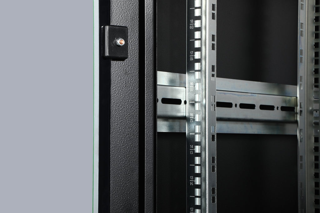 Los armarios de red de la serie Unique se han diseñado y fabricado para un cableado de red especialmente cómodo y flexible. Las sofisticadas optimizaciones ofrecen una estabilidad acorde con el mercado con la máxima flexibilidad. Un chasis base modular, que puede abrirse mediante paneles ciegos atornillados de 483 mm (19"), ofrece espacio suficiente para cables de todo tipo. También hay entradas de cables con cepillos en la parte trasera del chasis base. Las bandas de escobillas traseras situadas encima y debajo de la puerta trasera (a partir de 26U) permiten su uso en una amplia gama de escenarios de aplicación. Los amplios conductos de cables verticales con ayudas para el guiado de cables y tapa, instalados en la parte delantera (a partir de 800 mm de ancho de armario), completan a la perfección las versátiles características del armario de red. En el interior hay instalados dos pares de carriles de perfil de 483 mm (19") galvanizados y con manivela, etiquetados con unidades de altura que pueden leerse en direcciones opuestas. Se pueden ajustar de forma continua y están conectados a puntales de profundidad adicionales en el armario. Cada armario es una robusta construcción de chapa de acero de hasta 1,5 mm de grosor. La coloración se realiza mediante recubrimiento electrostático en polvo en los colores estándar gris (RAL 7035) y negro (RAL 9005). Los paneles laterales y las puertas modulares bloqueables y desmontables mejoran la accesibilidad. Las bisagras de las puertas se pueden cambiar. Además, los armarios pueden desmontarse completamente en caso necesario gracias a su diseño desmontable.