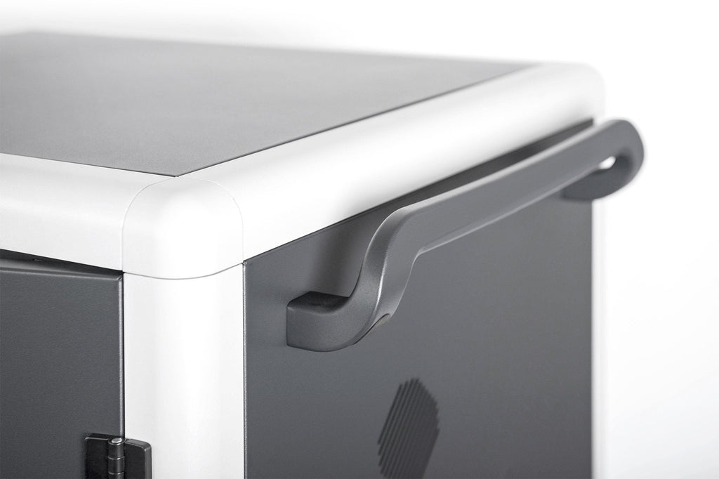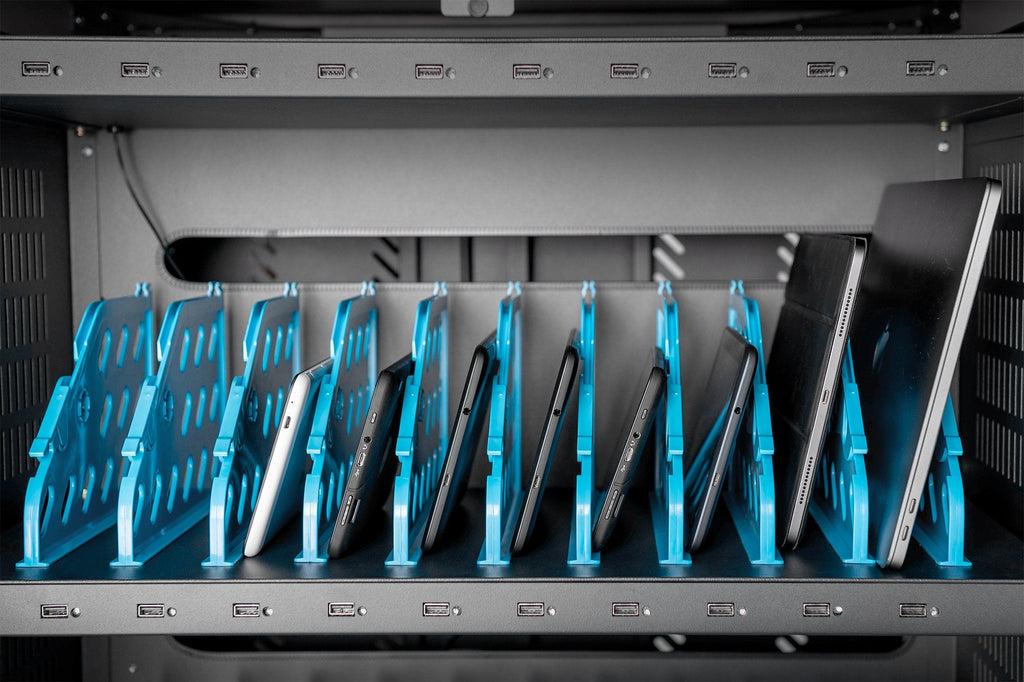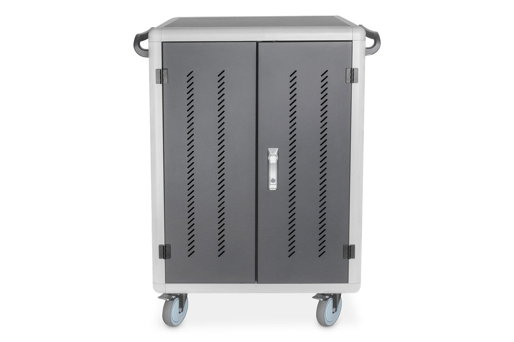 El armario de carga móvil de DIGITUS® es la solución ideal y compacta para guardar y cargar sus dispositivos portátiles, tales como notebooks y tabletas. Los armarios de carga móviles se utilizan con frecuencia en instalaciones públicas, p. ej., escuelas, para poder guardar los dispositivos de forma segura en un lugar central y cargarlos al mismo tiempo. El armario contiene 3 filas de 10 compartimentos de carga, cada uno de los cuales dispone de una conexión USB propia en la parte frontal. Adicionalmente, los dispositivos se pueden conectar con regletas de enchufes instaladas en la parte posterior (3 x 10 con contacto de puesta a tierra). Los conductos para cables y las bandejas para longitudes de cable sobrantes ampliamente dimensionados garantizan la gestión óptima de los cables. Los ventiladores instalados (3 x 24 V) en combinación con las rendijas de ventilación aseguran la disipación de calor activa del armario.