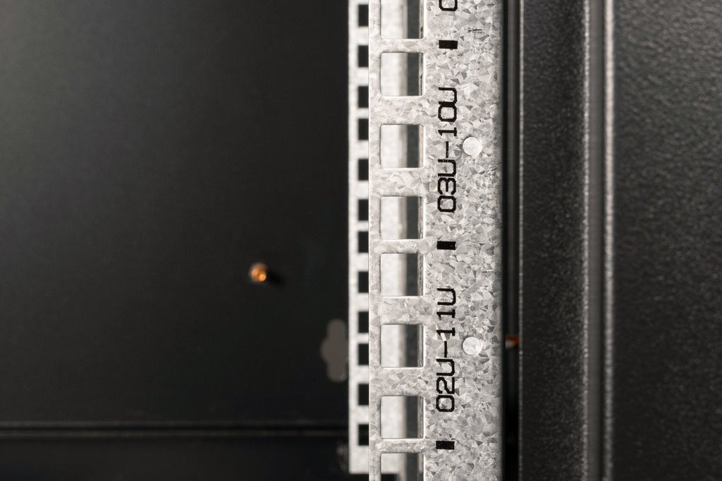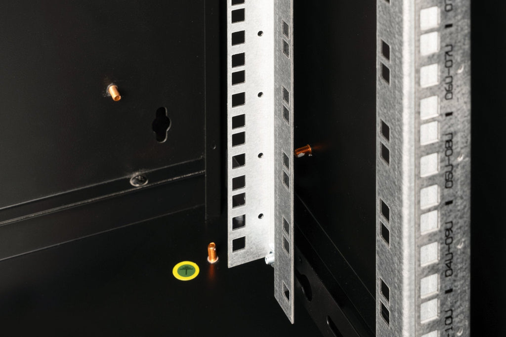 - Carriles de perfil de 483 mm (19'') instalados en la parte delantera y trasera del armario, galvanizados