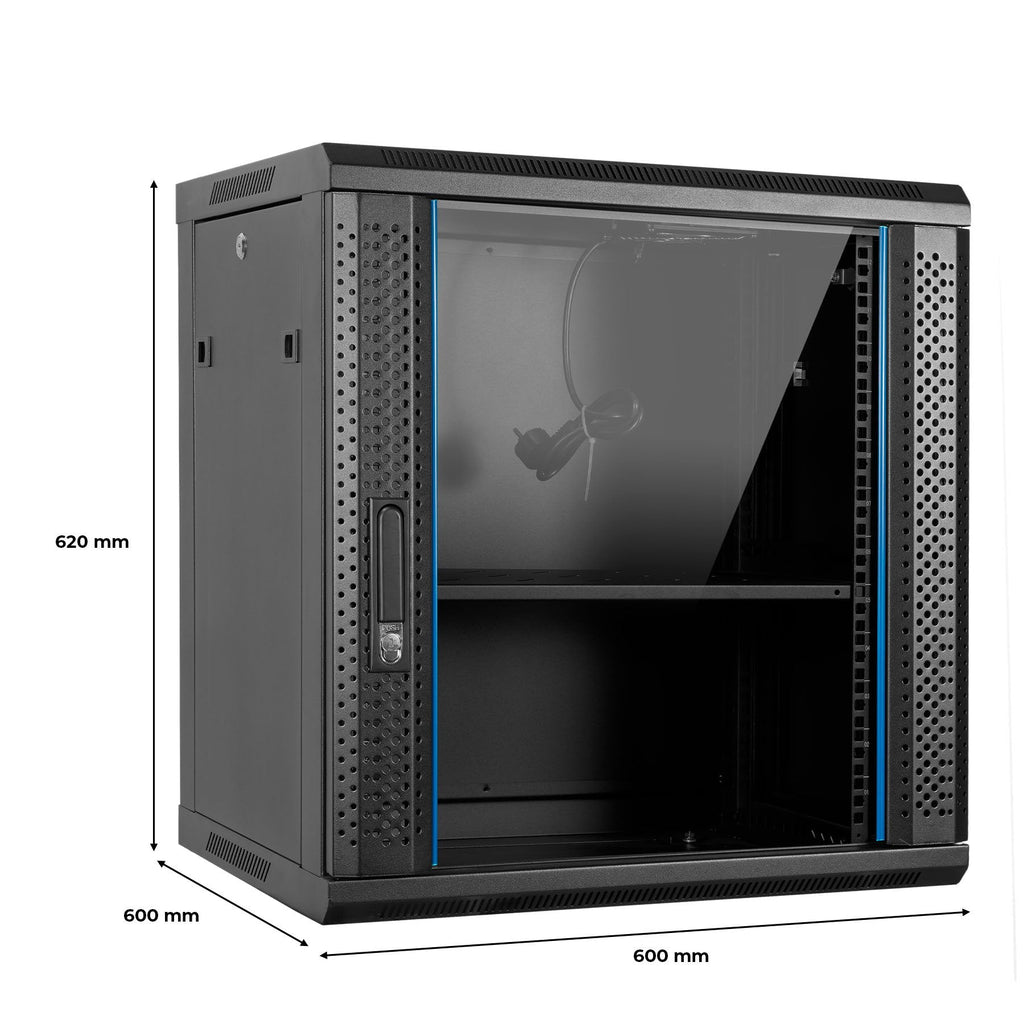 - Armario rack mural con ancho estándar de 19” (482,6 mm), con amplio espacio interior para componentes y cableado. Diseño compacto y resistente.