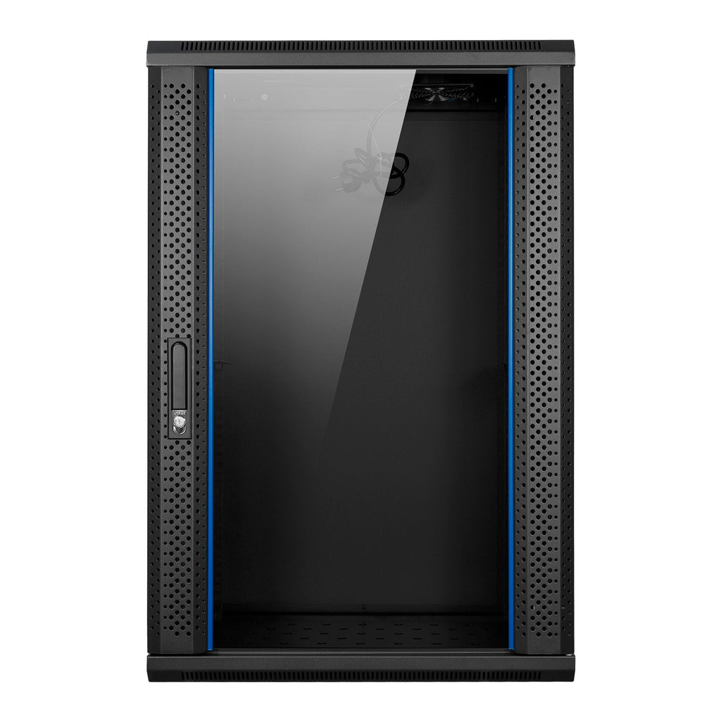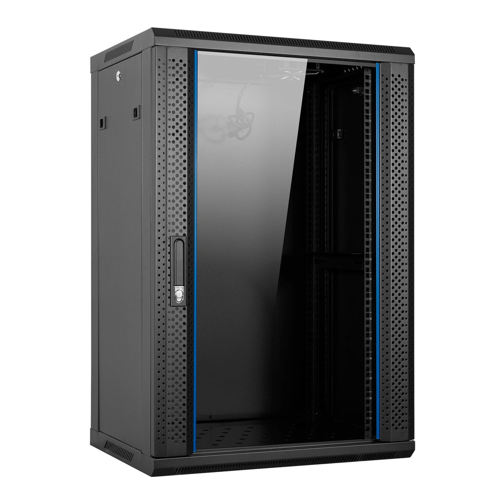 - Armario rack mural con ancho estándar de 19” (482,6 mm), con amplio espacio interior para componentes y cableado. Diseño compacto y resistente.