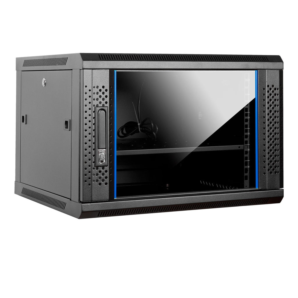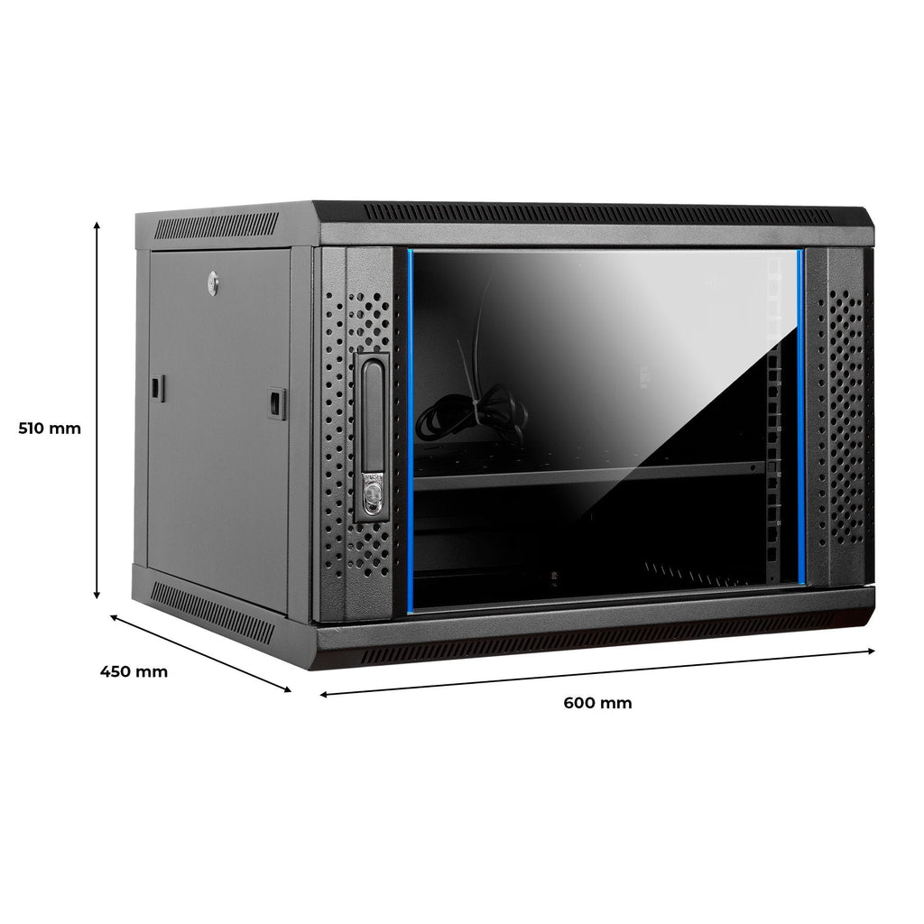 - Armario rack mural con ancho estándar de 19” (482,6 mm), con amplio espacio interior para componentes y cableado. Diseño compacto y resistente.