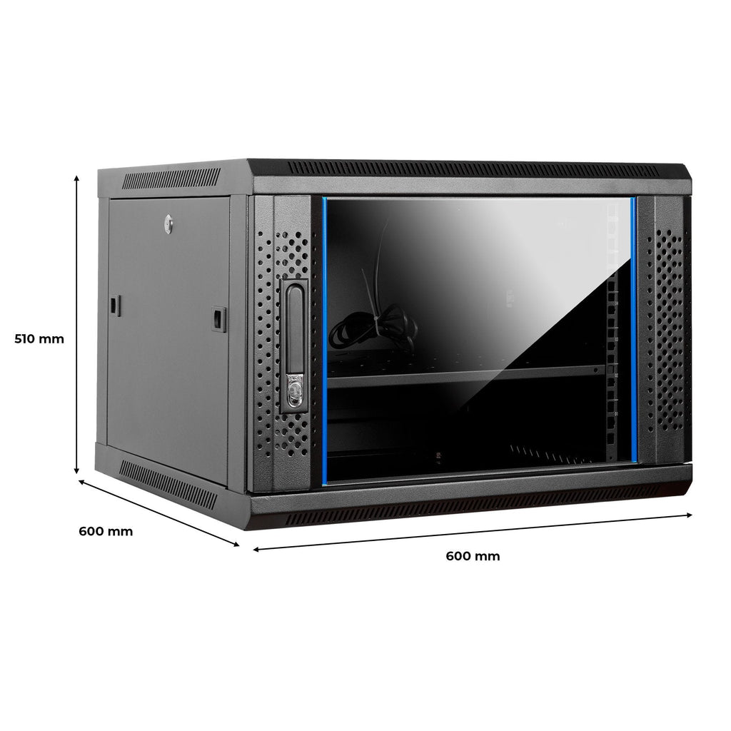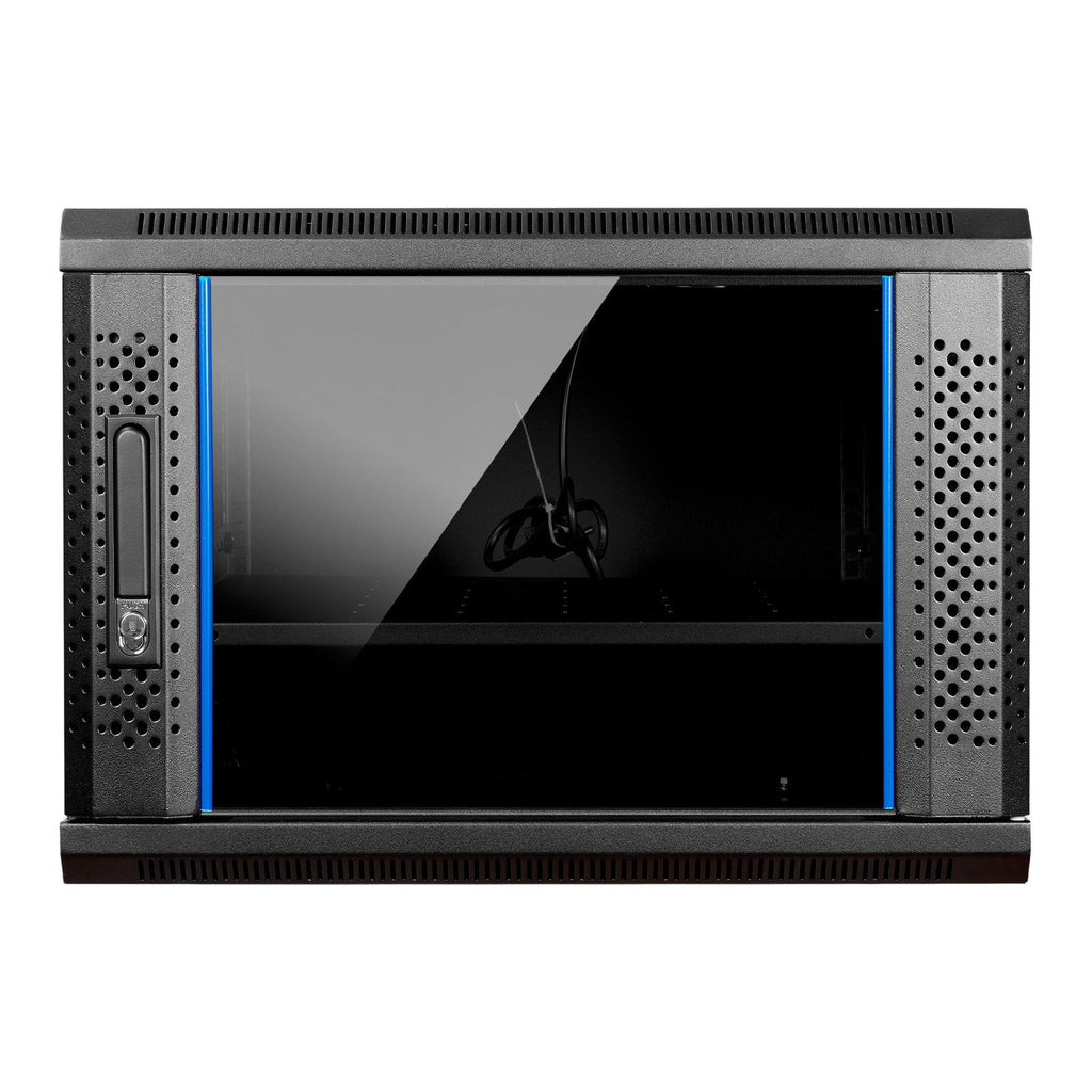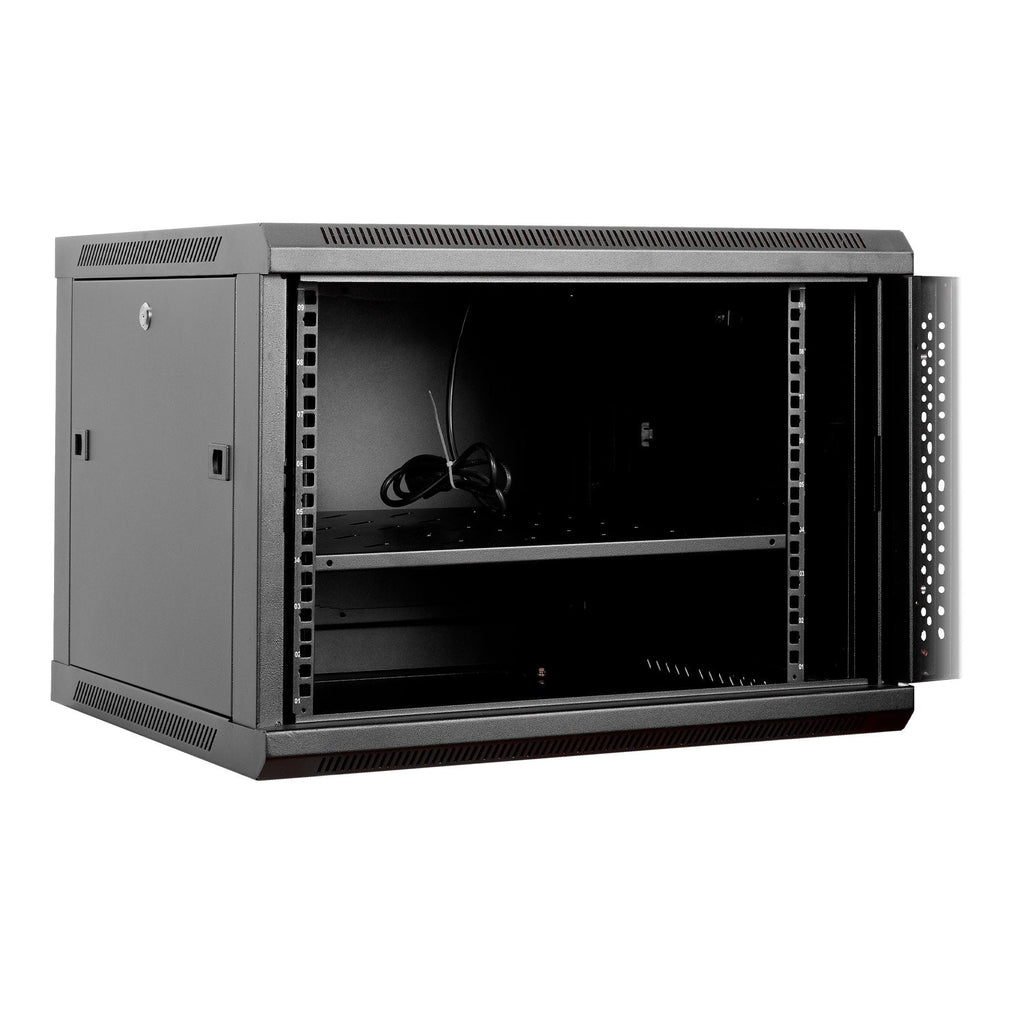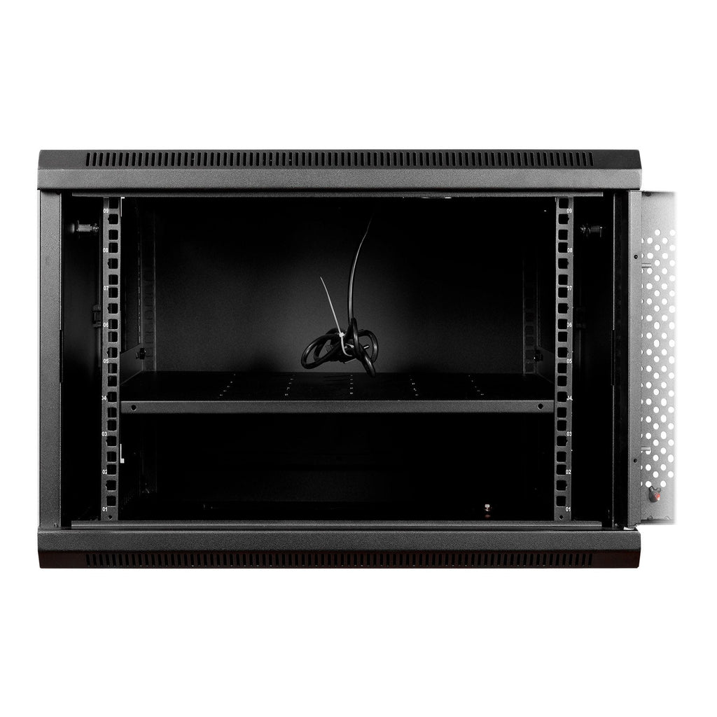 - Armario rack mural con ancho estándar de 19” (482,6 mm), con amplio espacio interior para componentes y cableado. Diseño compacto y resistente.