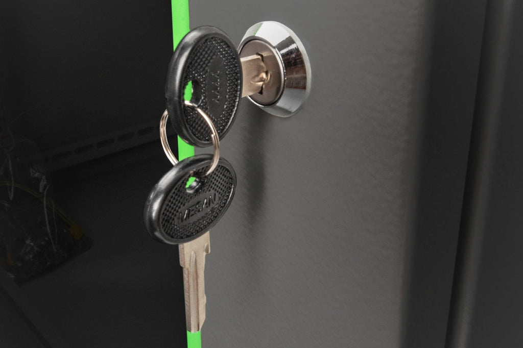 Los armarios de red para el montaje en la pared de la serie Dynamic han sido desarrollados para la ampliación sencilla y especialmente económica de redes. El techo, la base y la pared trasera de cada armario poseen una entrada para cables pretroquelada. Para el alojamiento de un módulo ventilador se incluye además una zona troquelada en el chasis de techo. En el interior están instalados dos pares de guías de perfil de 483 mm (19") galvanizadas y rotuladas con unidades de altura legibles desde ambos lados. Estas se pueden ajustar en profundidad. Cada armario es una robusta construcción de acero, hecha de chapa de acero con un grosor de hasta 1,5 mm. El proceso de pintado se realiza en forma de un recubrimiento de polvo electrostático en los colores estándar gris (RAL 7035) y negro (RAL 9005). Las paredes laterales desmontables y la puerta frontal desmontable y con cerradura facilitan el acceso. Es posible cambiar de lado las bisagras de las puertas. El montaje en la pared se realiza en dos pasos sencillos: La chapa de montaje se atornilla en la pared y se conecta después con la carcasa.