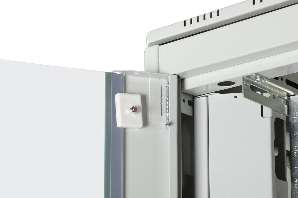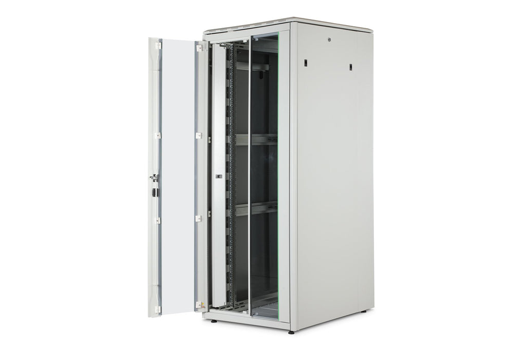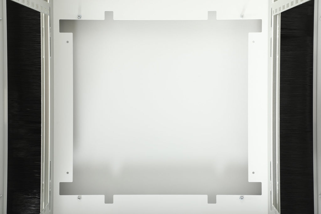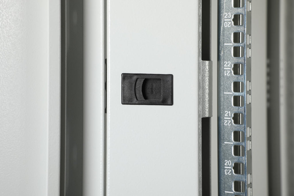Los armarios de red de la serie Unique han sido desarrollados para un cableado de redes particularmente cómodo y flexible. Las entradas equipadas con cepillos en el techo y la base (a partir de 26UA y un ancho del armario de 800 mm), una entrada deslizante en el chasis de base con junta de caucho celular, así como las tiras de cepillo posteriores por encima y por debajo de la puerta trasera (a partir de 26UA) permiten un uso versátil con los escenarios de aplicación más diversos. El diseño se completa con canales para la conducción de cables verticales con panel, instalados al lado de las guías de perfil (en armarios con un ancho a partir de 800 mm). Una tapa desmontable separada con ranuras de ventilación mejora la circulación del aire. Está asentada por encima de una construcción especial para el alojamiento sencillo de un módulo de ventilación. En el interior están instalados dos pares de guías de perfil de 483 mm (19") galvanizadas y rotuladas con unidades de altura legibles desde ambos lados. Se pueden regular en profundidad y están conectadas con elementos de profundidad adicionales en el armario. Cada armario es una robusta construcción de acero, hecha de chapa de acero con un grosor de hasta 1,5 mm. El proceso de pintado se realiza en forma de un recubrimiento de polvo electrostático en los colores estándar gris (RAL 7035) y negro (RAL 9005). Las paredes laterales modulares y puertas extraíbles y dotadas de cerraduras facilitan el acceso. Es posible cambiar de lado las bisagras de las puertas. Asimismo, el diseño desmontable de los armarios permite desarmarlos por completo si es necesario.
