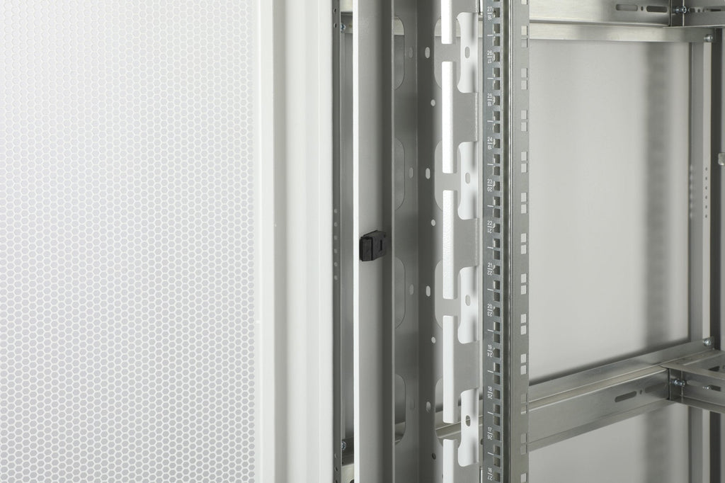 Los armarios de red de la serie Unique se han diseñado y fabricado para un cableado de red especialmente cómodo y flexible. Las sofisticadas optimizaciones ofrecen una estabilidad acorde con el mercado con la máxima flexibilidad. Un chasis base modular, que puede abrirse mediante paneles ciegos atornillados de 483 mm (19"), ofrece espacio suficiente para cables de todo tipo. Además, hay entradas de cables laterales con escobillas en la parte superior e inferior del armario, así como otra en la parte trasera del chasis base. Los generosos conductos de cables verticales con ayudas para el guiado de cables y tapa, instalados en la parte delantera (a partir de 800 mm de ancho de armario), completan a la perfección las versátiles características del armario de red. En el interior hay instalados dos pares de raíles de perfil de 483 mm (19") galvanizados y con manivela, etiquetados con unidades de altura que pueden leerse en direcciones opuestas. Se pueden ajustar de forma continua y están conectados a puntales de profundidad adicionales en el armario. Cada armario es una robusta construcción de chapa de acero de hasta 1,5 mm de grosor. La coloración se realiza mediante recubrimiento electrostático en polvo en los colores estándar gris (RAL 7035) y negro (RAL 9005). Los paneles laterales y las puertas modulares bloqueables y desmontables mejoran la accesibilidad. Las bisagras de las puertas pueden cambiarse. Además, los armarios pueden desmontarse completamente en caso necesario gracias a su diseño desmontable.