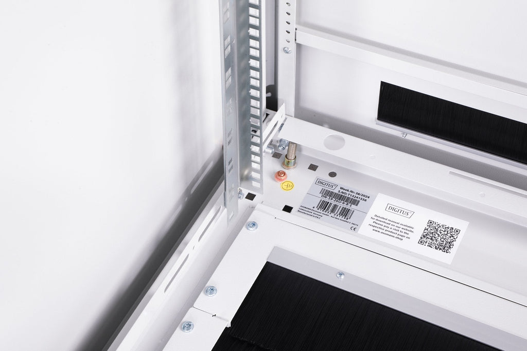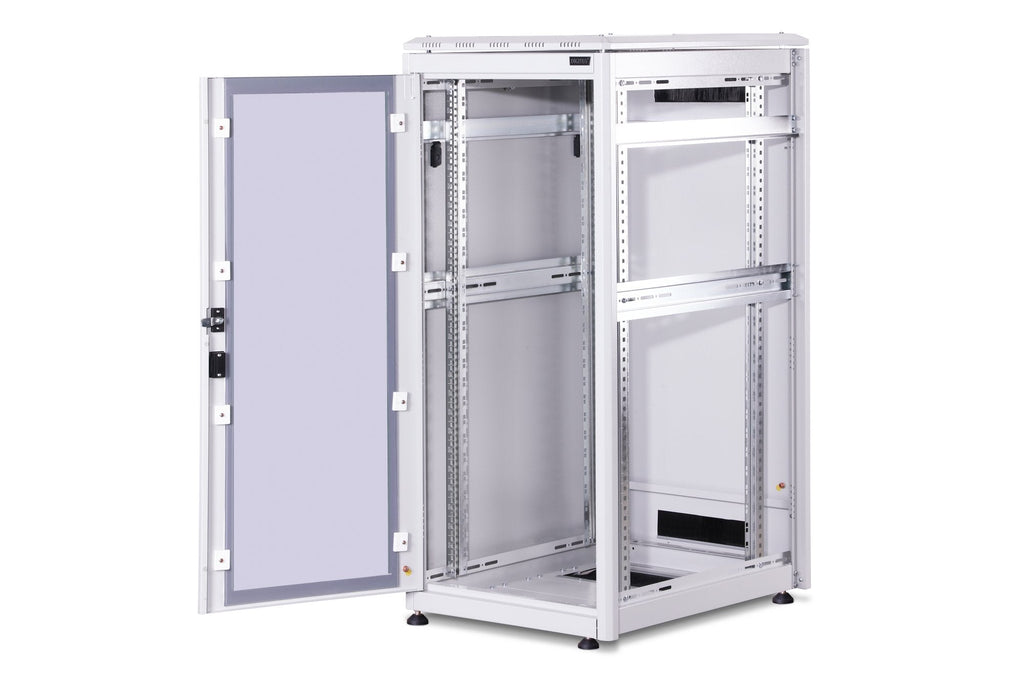 Los armarios de red de la serie Unique se han diseñado y fabricado para un cableado de red especialmente cómodo y flexible. Las sofisticadas optimizaciones ofrecen una estabilidad acorde con el mercado con la máxima flexibilidad. Un chasis base modular, que puede abrirse mediante paneles ciegos atornillados de 483 mm (19"), ofrece espacio suficiente para cables de todo tipo. También hay entradas de cables con cepillos en la parte trasera del chasis base. Las bandas de escobillas traseras situadas encima y debajo de la puerta trasera (a partir de 26U) permiten su uso en una amplia gama de escenarios de aplicación. Los amplios conductos de cables verticales con ayudas para el guiado de cables y tapa, instalados en la parte delantera (a partir de 800 mm de ancho de armario), completan a la perfección las versátiles características del armario de red. En el interior hay instalados dos pares de carriles de perfil de 483 mm (19") galvanizados y con manivela, etiquetados con unidades de altura que pueden leerse en direcciones opuestas. Se pueden ajustar de forma continua y están conectados a puntales de profundidad adicionales en el armario. Cada armario es una robusta construcción de chapa de acero de hasta 1,5 mm de grosor. La coloración se realiza mediante recubrimiento electrostático en polvo en los colores estándar gris (RAL 7035) y negro (RAL 9005). Los paneles laterales y las puertas modulares bloqueables y desmontables mejoran la accesibilidad. Las bisagras de las puertas se pueden cambiar. Además, los armarios pueden desmontarse completamente en caso necesario gracias a su diseño desmontable.
