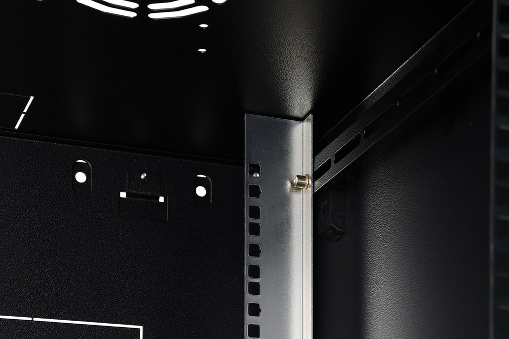 Los armarios de red para el montaje en la pared de la serie Dynamic han sido desarrollados para la ampliación sencilla y especialmente económica de redes. El techo, la base y la pared trasera de cada armario poseen una entrada para cables pretroquelada. Para el alojamiento de un módulo ventilador se incluye además una zona troquelada en el chasis de techo. En el interior están instalados dos pares de guías de perfil de 483 mm (19") galvanizadas y rotuladas con unidades de altura legibles desde ambos lados. Estas se pueden ajustar en profundidad. Cada armario es una robusta construcción de acero, hecha de chapa de acero con un grosor de hasta 1,5 mm. El proceso de pintado se realiza en forma de un recubrimiento de polvo electrostático en los colores estándar gris (RAL 7035) y negro (RAL 9005). Las paredes laterales desmontables y la puerta frontal desmontable y con cerradura facilitan el acceso. Es posible cambiar de lado las bisagras de las puertas. El montaje en la pared se realiza en dos pasos sencillos: La chapa de montaje se atornilla en la pared y se conecta después con la carcasa.