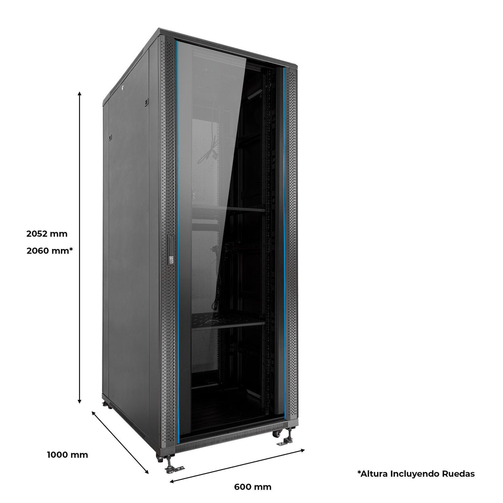 Distintas alturas y capacidades que van desde 22U a 47U, con anchos de entre 600 mm a 800 mm y fondos entre 600 mm a 1000 mm. Todos los armarios poseen puertas de cristal, perforadas o, en el caso de los armarios más grandes, existe la opción de doble puerta, lo que permite trabajar en una parte del mueble mientras la otra parte está cerrada y protegida.