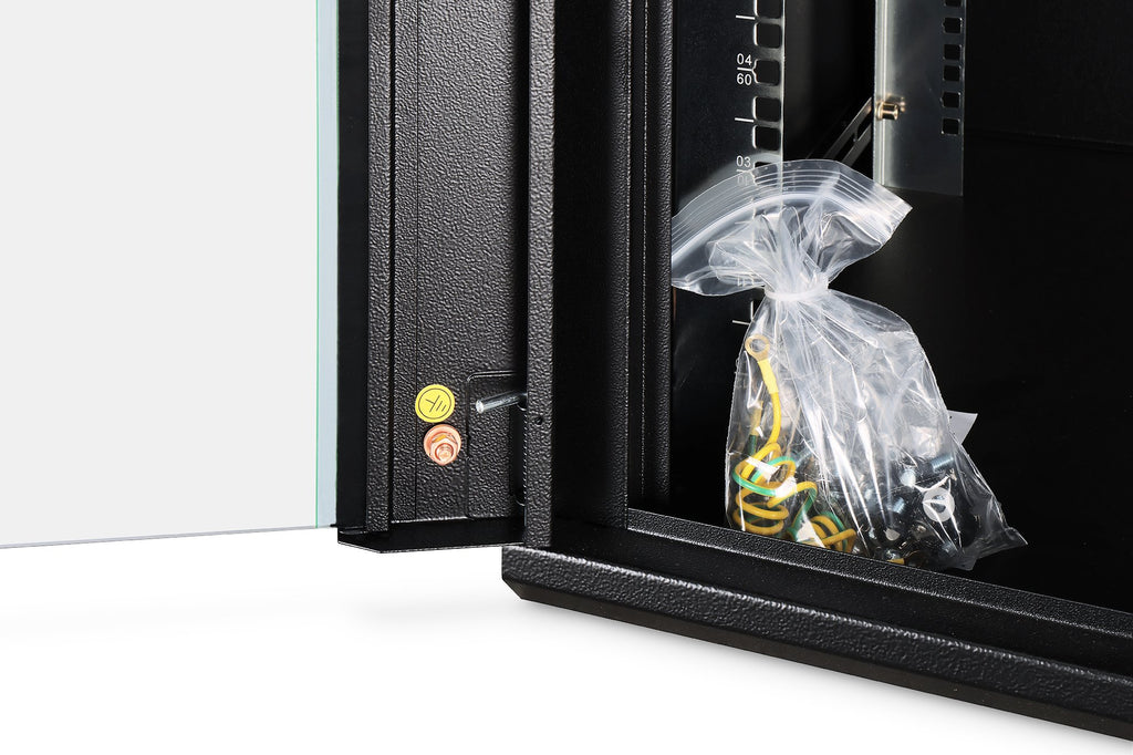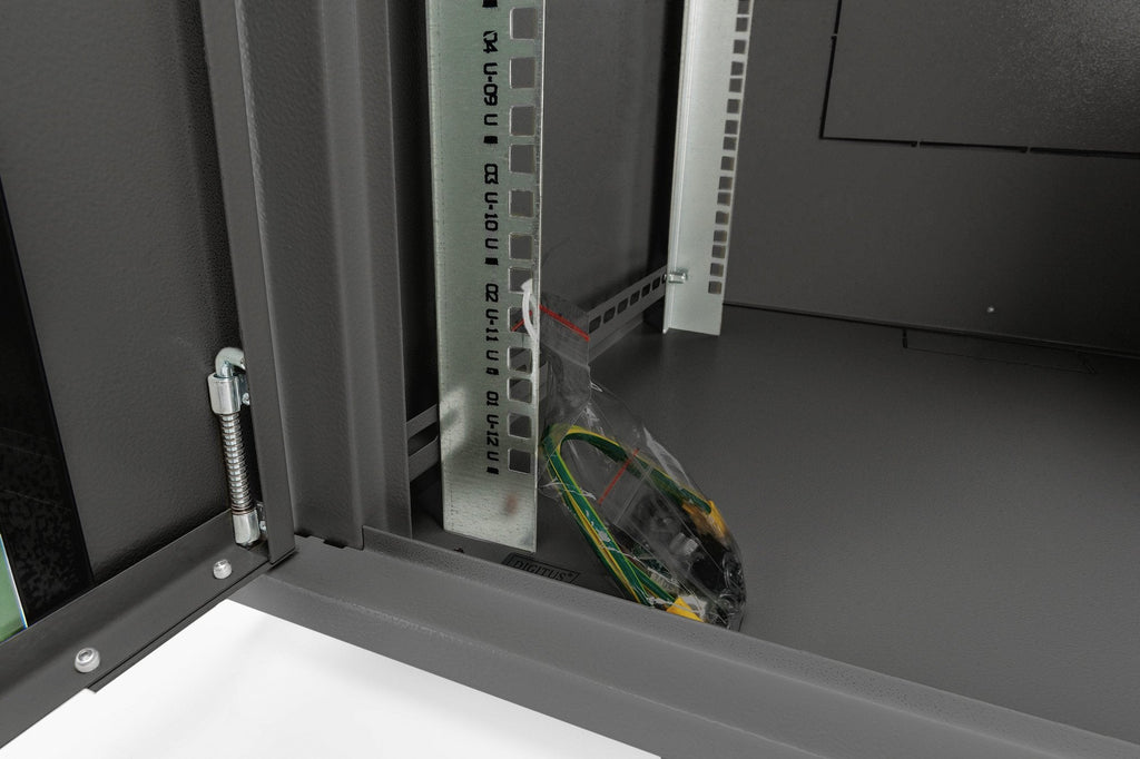 Los armarios de red para el montaje en la pared de la serie Dynamic han sido desarrollados para la ampliación sencilla y especialmente económica de redes. El techo, la base y la pared trasera de cada armario poseen una entrada para cables pretroquelada. Para el alojamiento de un módulo ventilador se incluye además una zona troquelada en el chasis de techo. En el interior están instalados dos pares de guías de perfil de 483 mm (19") galvanizadas y rotuladas con unidades de altura legibles desde ambos lados. Estas se pueden ajustar en profundidad. Cada armario es una robusta construcción de acero, hecha de chapa de acero con un grosor de hasta 1,5 mm. El proceso de pintado se realiza en forma de un recubrimiento de polvo electrostático en los colores estándar gris (RAL 7035) y negro (RAL 9005). Las paredes laterales desmontables y la puerta frontal desmontable y con cerradura facilitan el acceso. Es posible cambiar de lado las bisagras de las puertas. El montaje en la pared se realiza en dos pasos sencillos: La chapa de montaje se atornilla en la pared y se conecta después con la carcasa.
