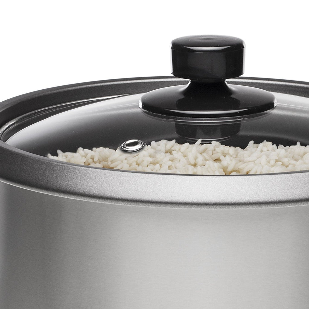 El diseño en acero inoxidable no solo da un aspecto moderno y elegante a la arrocera sino que también la hace resistente al calor. Para más seguridad la arrocera se apaga automáticamente cuando alcanza la temperatura correcta. La bandeja de asar extraíble tiene un recubrimiento antiadherente para una fácil limpieza y es apta para el lavavajillas.