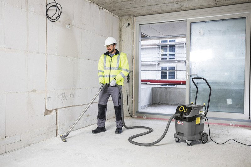Nuestro aspirador en seco y húmedo NT 40/1 Tact Te es el equipo ideal para todos los que consideran que un gran volumen del recipiente es tan importante como un alto grado de movilidad. Su gran depósito robusto de 40 l, que recoge sin problemas todo tipo de suciedad y polvo —desde el más fino hasta el más grueso—, además de líquidos, dispone de un protector y rodillos de dirección metal de larga vida útil. De este modo, siempre son posibles unos intervalos de trabajo largos y sin interrupciones. Y, por si fuera poco, de ello se ocupan también el excelente sistema de limpieza del filtro Tact y el filtro plegado plano PES resistente a la humedad. El nuevo selector giratorio central para seleccionar los programas de aspiración, una regulación continua del número de revoluciones y la toma de corriente integrada del equipo garantizan un cómodo manejo. Las dimensiones compactas del equipo facilitan el manejo y transporte, y además está disponible opcionalmente un asa de empuje ergonómica que se puede montar o desmontar rápidamente. Ya sea en el recinto de producción, en el taller o en la obra: todos los usuarios se benefician del extenso y nuevo equipamiento de accesorios que se puede almacenar o fijar directamente fuera y dentro del equipo.