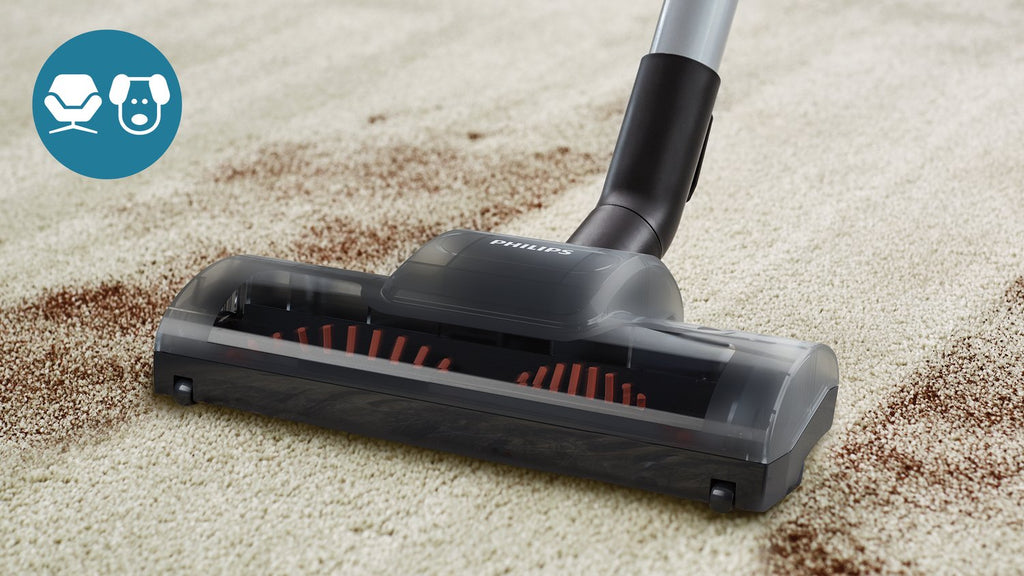 El cepillo Turbo giratorio está diseñado para una limpieza óptima del pelo de las mascotas y las pelusas, ya que abre las fibras de las alfombras para una limpieza más profunda.