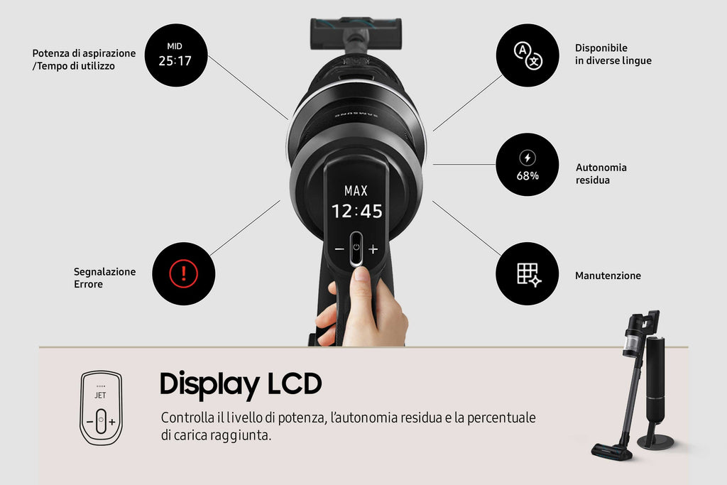 La aspiradora adapta automáticamente el tipo de succión y la velocidad del cepillo según el tipo de suelo. Además, con SmartThings podrás ver el estado de la batería o la bolsa y controlar el consumo energético.