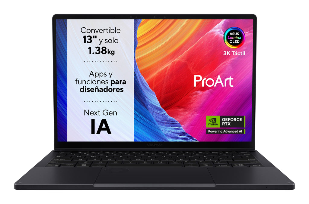 Te presentamos el ProArt PX13: el portátil convertible de 13 pulgadas diseñado para ti. Cambia de modo sin esfuerzo y está listo para potenciar tu pasión creativa cada vez que te llegue la inspiración. La pantalla táctil OLED garantiza una precisión cromática exacta para realizar pruebas impecables, mientras que los puertos de E/S de gran versatilidad conectan a la perfección todos tus periféricos. Este portátil validado por NVIDIA® Studio incorpora una GPU GeForce RTX™ de la serie 40 para portátiles, que proporciona unos gráficos potentes y un rendimiento con IA de 321 TOPS. El ProArt PX13 cuenta con funciones creativas mejoradas con IA, resistencia de calidad militar y una batería de larga duración, por lo que transforma cualquier entorno en el estudio.