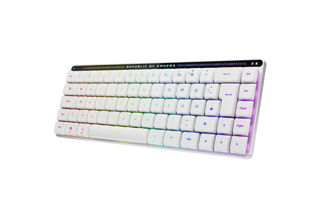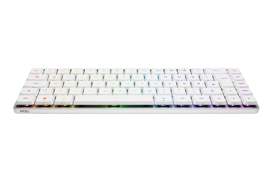 ASUS ROG Falchion RX Low Profile, 65%, Inalámbrico y alámbrico, USB + RF Wireless + Bluetooth, Switch de tecla óptico, LED RGB, Blanco