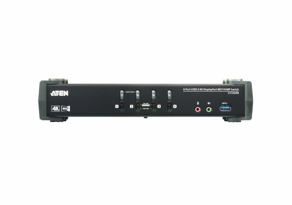 Como cuenta con la tecnología Transporte multisecuencia (MST) más moderna, el switch CS1924M de cuatro puertos USB 3.0 4K DisplayPort MST KVMP™ es el primer switch DisplayPort KVM del mundo con hub MST integrado. El CS1924M permite a los usuarios utilizar dos pantallas de consola desde una única fuente de vídeo DisplayPort 1.2, lo que proporciona un modo de escritorio ampliado y un modo distribuidor con resoluciones hasta 4K para disfrutar de multitarea en dos pantallas al tiempo que se reducen las conexiones de cables.