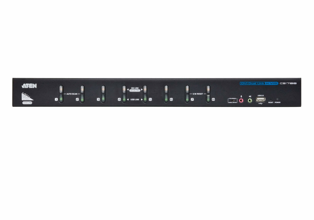 El switch KVM para consola USB de 8 puertos e interfaz DVI Dual Link CS1788 es una unidad multifuncional que permite acceder a y controlar 8 computadoras desde una consola con un teclado USB, mouse USB y dos monitores (DVI-I y VGA).