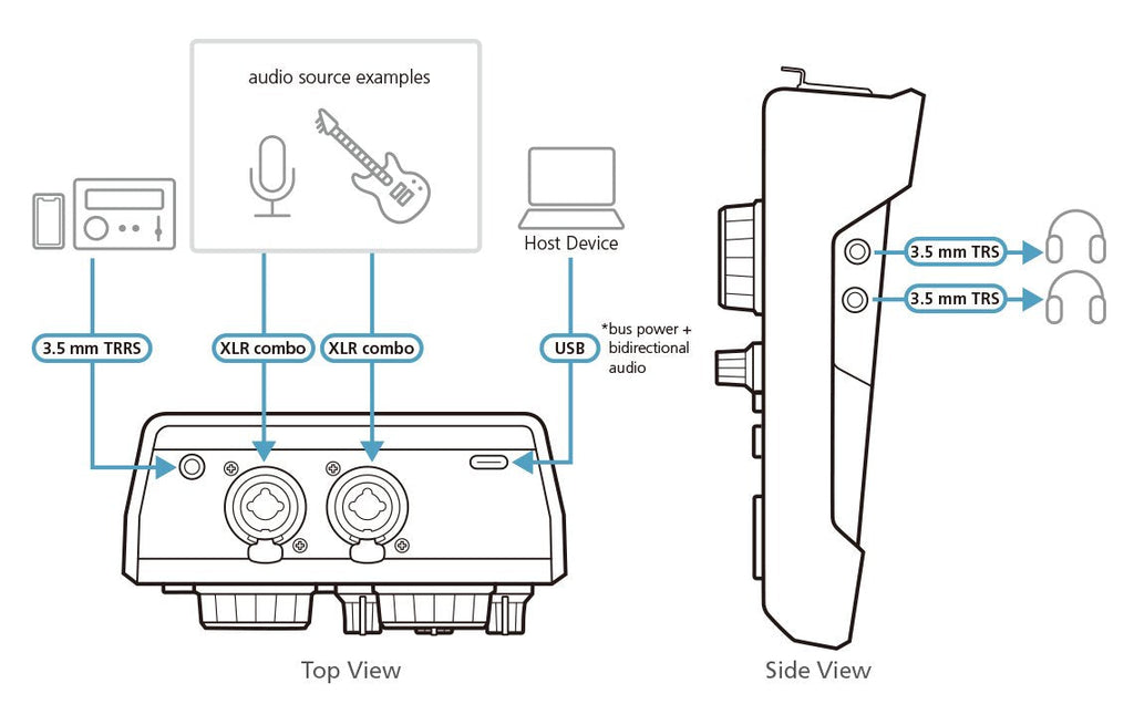 Con dos entradas de conector combinado (XLR/6,3 mm para micrófono o instrumento), alimentación fantasma y un preamplificador de calidad de estudio, puede conectar micrófonos de condensador de nivel profesional y cualquier instrumento para obtener una señal nítida y de bajo nivel de ruido con reproducción y grabaciones de alta resolución a 24 bits/96 kHz. Las dos salidas de auriculares permiten la monitorización de dos personas, cada una con un control de volumen. Atienda fácilmente llamadas a distancia o reproduzca música de fondo desde un smartphone gracias a la entrada TRRS de 3,5 mm.