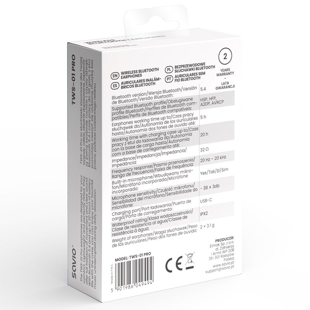 Savio TWS-01 PRO auricular y casco Auriculares Inalámbrico Dentro de oído Música/uso diario Bluetooth Blanco