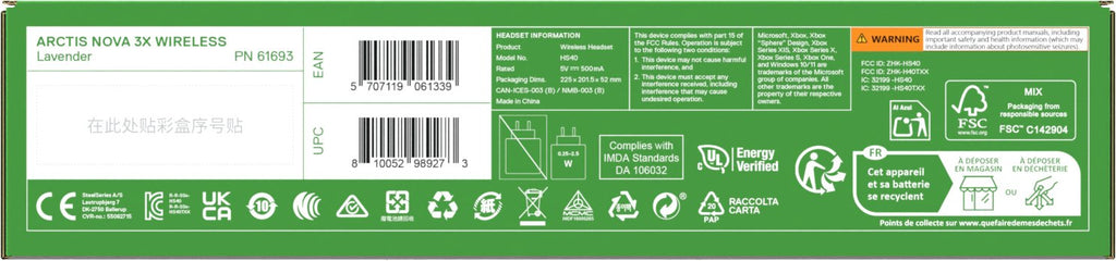 Steelseries Arctis Nova 3X, Inalámbrico, 20 - 22000 Hz, Música/uso diario, 260 g, Auriculares, Lavanda